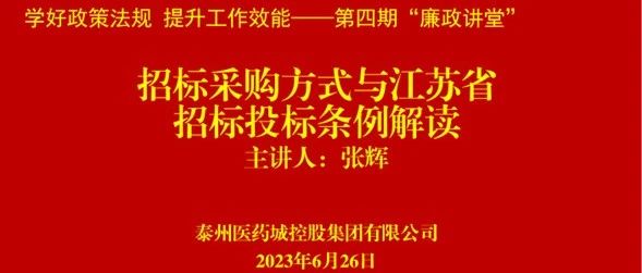 学好政策法规 提升工作效能——集团公司举办招标投标领域廉政讲堂泰州医药城控股集团有限公司为促进国有企业招标投标领域廉政风险防控建设,进一步加强招标投标领域法律法规宣传,提升招标投标管理及从业人员的业务能力和水平,6月26日下午,集团公司组织召开第四期廉政讲堂,···