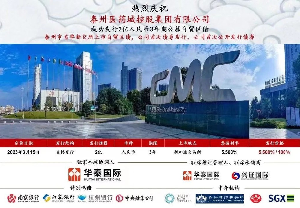 热烈庆祝泰州医药城控股集团有限公司成功发行2亿人民币3年期公募自贸区债